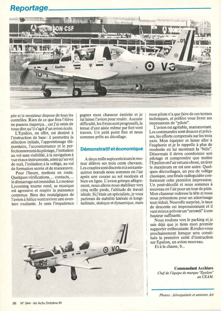 Egalement transmis par Stéphane Mayer l’information sur la parution d’« Air Actualités » de septembre 2019, où un article est consacré à l’arrivée du PC 21 à Cognac, ainsi que dans la section « retro » cet article sur … l’arrivée de l’Epsilon, paru dans la même revue en octobre 1981.